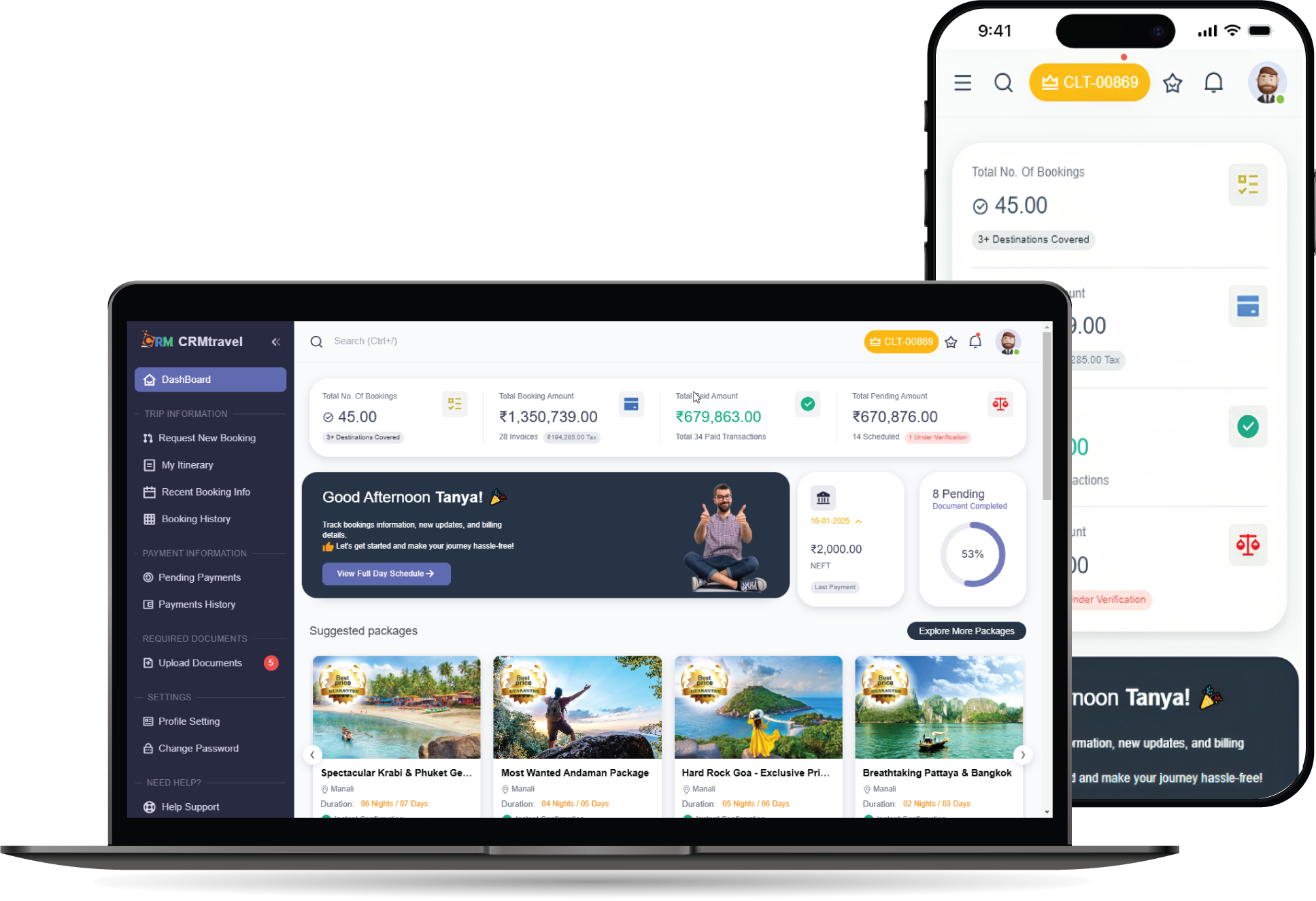 Seamless connectivity between Agents, Clients & CRMTravel. Manage bookings, upload documents, track services, make payments, and stay connected with your operations team—anytime, anywhere.